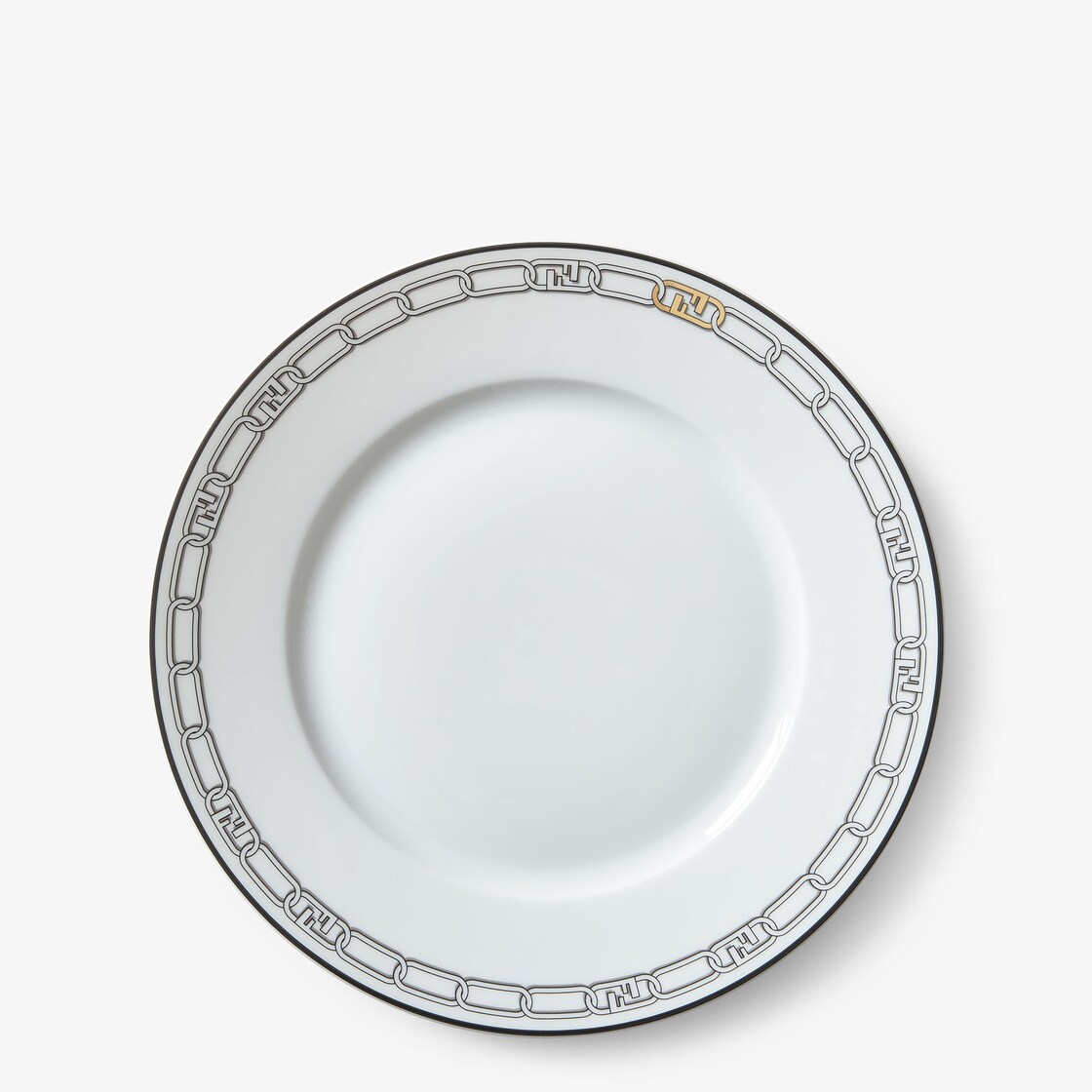 Set consisting of two dinner plates in the finest Limoges porcelain, decorated with the Fendi O’Lock Chain motif. Designed exclusively for the tableware line, they come in white and black with delicate gold-coloured accents. In her conception of the new Fendi Casa universe, Silvia Venturini Fendi redesigns the collection accessories drawing inspiration from the fashion house’s DNA. Italian design is expressed in the choice of quality materials, functionality and aesthetics in a harmonious balance of style and timeless elegance.