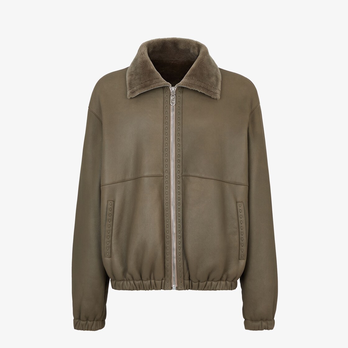 Oversized blouson jacket with high collar. Elasticated cuffs and edge. Side pockets and low-set sleeves. Zip fastening. Made of dove grey leather with matching-colour shearling lining. Embellished with matching Selleria stitching and embossed FF detail on the back of the collar. Metal Fendi O’Lock slider with a palladium finish.