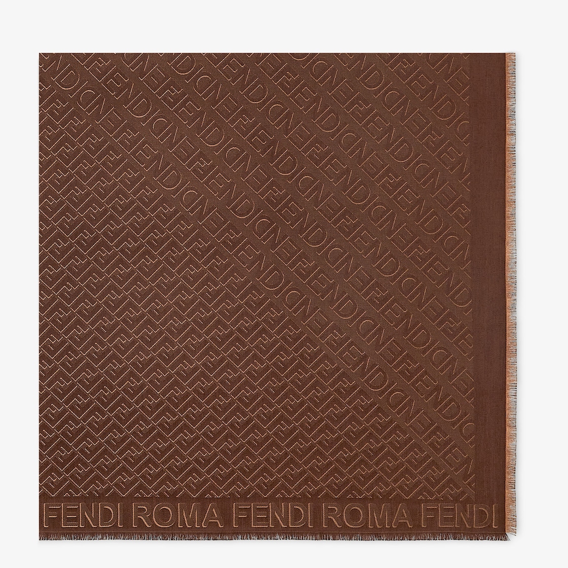 Large shawl made of a soft wool and silk blend in brown. The luxurious jacquard weave reproduces the FF and Fendi Mirror logos with a 3D effect, allowing it to be worn in various ways. Suitable for all seasons.