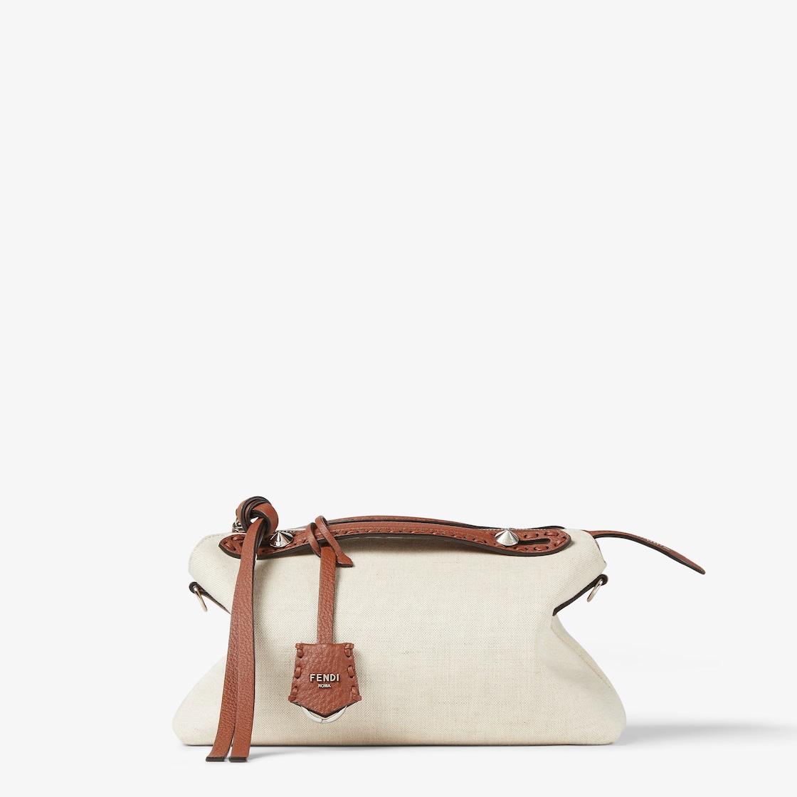 Made of natural-coloured canvas with brown Cuoio Romano leather and finished with hand-sewn tone-on-tone macro topstitches, an emblem of the iconic Selleria workmanship handed down through generations of Fendi artisans since 1925.