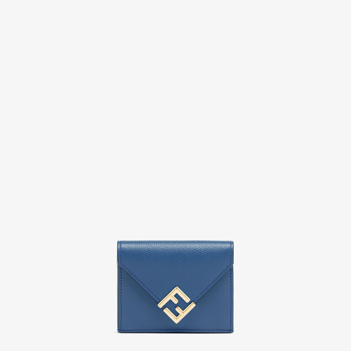 FF Diamonds medium tri-fold wallet. Divided into six card slots, a banknote compartment and a coin pocket with a press stud button. Made of blue calfskin. Gold-finish metalware.
