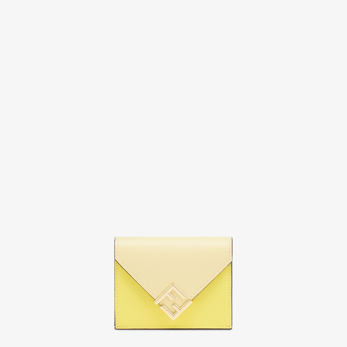 FF Diamonds medium tri-fold wallet. Divided into six card slots, a banknote compartment and a coin pocket with a press stud button. Made of yellow leather with a lighter coloured leather flap. Gold-finish metalware.
