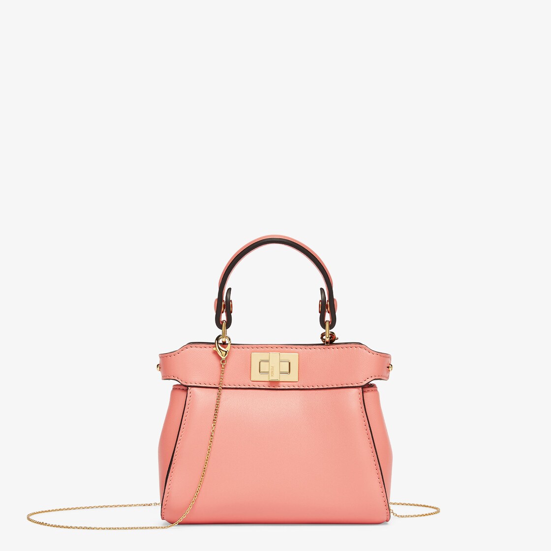 Iconic Nano Peekaboo bag with every detail recreated. Featuring a leather-lined interior, two compartments separated by a stiff partition, a removable handle with two press studs and the classic twist lock. It can be carried by hand or worn cross-body thanks to the fine chain shoulder strap. Made of peach pink nappa leather. Gold-finish metalware.
