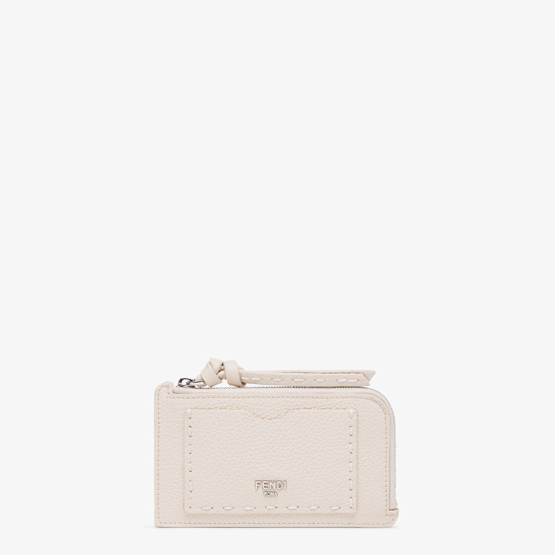 Peekaboo card holder with four back card slots, a central zip compartment and front card holder. Made of pink Cuoio Romano leather with hand stitching, the emblem of iconic Selleria workmanship. Palladium-finish metalware and metal FENDI logo.