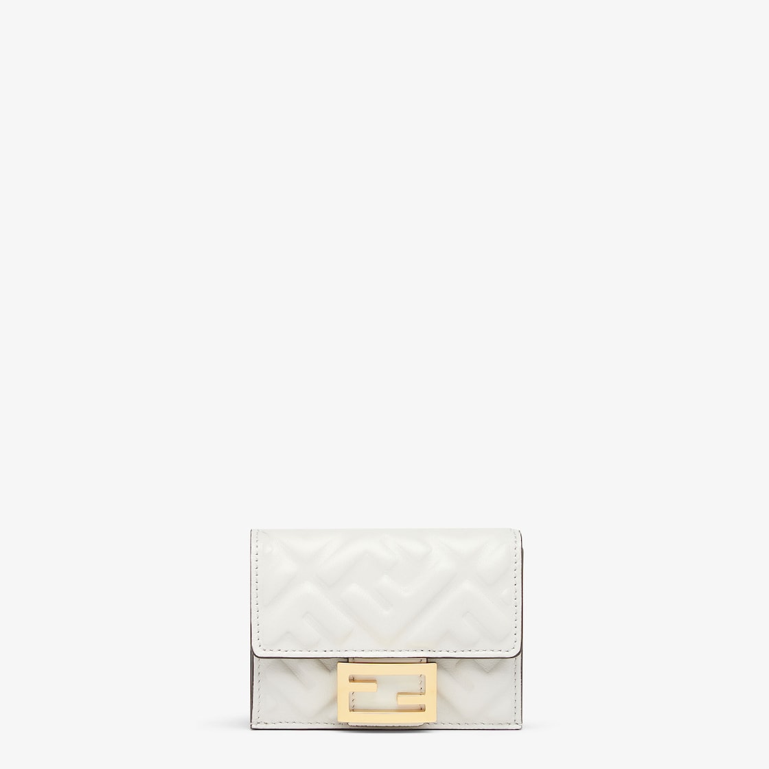 Compact, tri-fold Baguette wallet with large internal banknote compartment, three concealed card holders and an external coin purse with a press-stud fastening. Made of white nappa leather with 3D-textured FF motif. Gold-finish metalware.