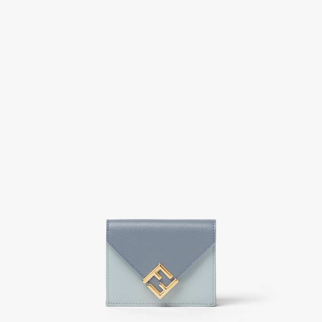 Medium FF Diamonds tri-fold wallet, geometric flap and diagonal FF logo. Divided into six card slots, a banknote compartment and a coin pocket with a press stud button. Made of mercury blue full-grain calfskin and light blue smooth leather. Gold-finish metalware.