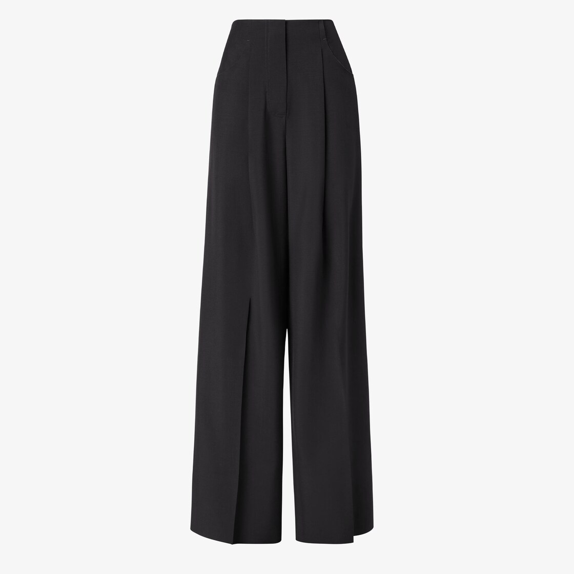 Wide leg trousers. Hip pockets and pleats at the front waist. Front concealed zip fastening. Made of black wool and mohair.