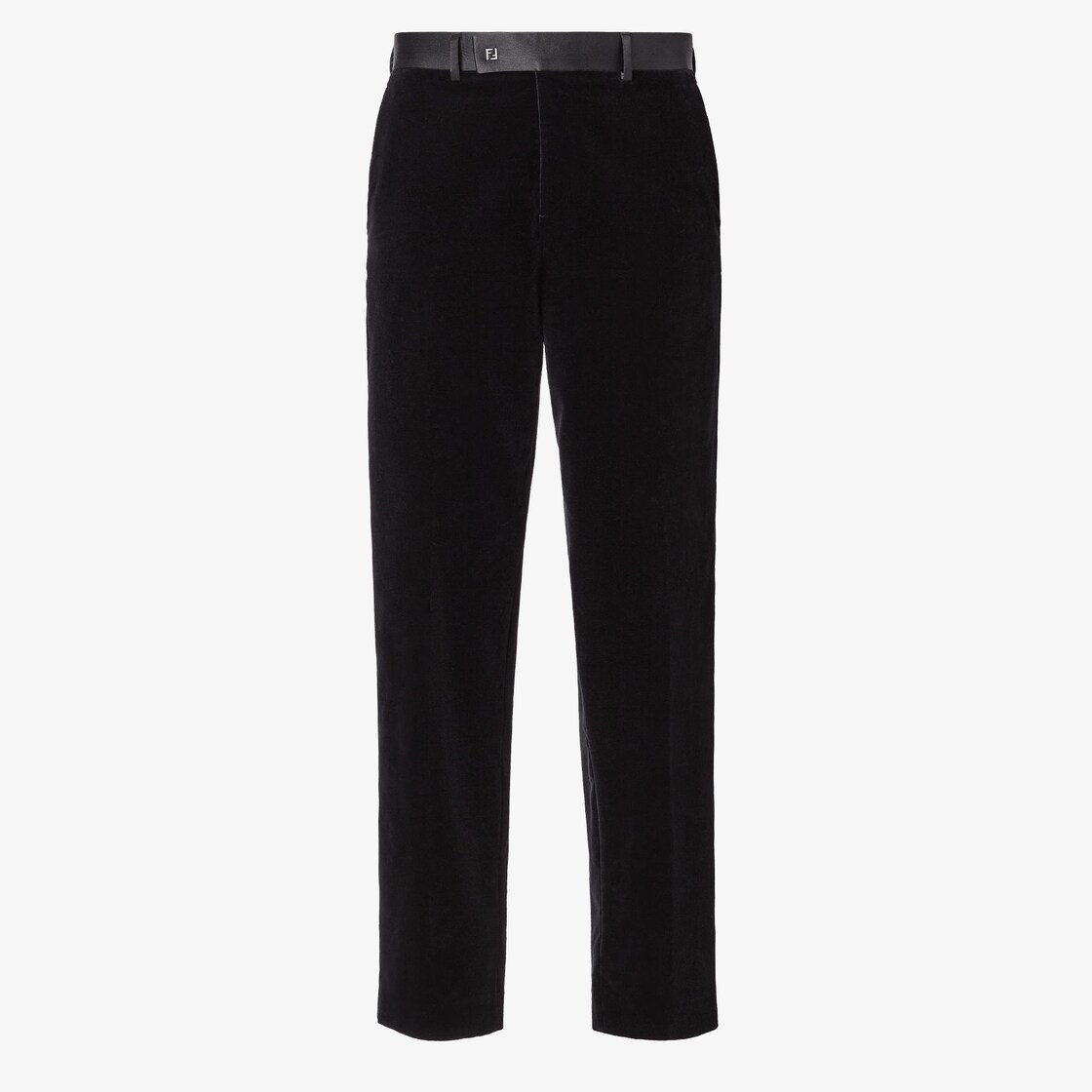 Cigarette trousers with side pockets and welt pockets on the back. Belt loops on the waistband and trouser crease. Concealed zip and hook fastening. Width at the hem: 22 cm. Made of black cotton velvet. Customised with a tone-on-tone satin waistband and a button-effect palladium metal micro FF logo applied on the waist.
