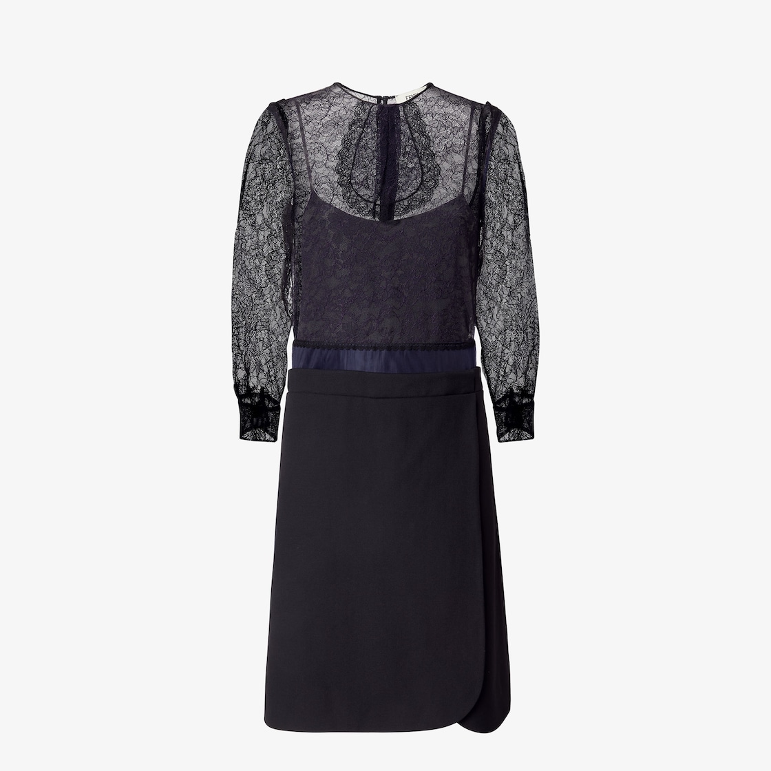 錯視效果中長洋裝,採圓領和3/4袖設計。襯衫袖口和包覆式半身裙。背面開合設計。有襯裡。由藍色紋理de poudre半身裙和類似短袖構成。搭配飾邊細節,正面飾有同色系蕾絲jabot圖案。