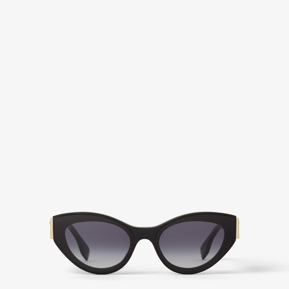 貓眼黑色醋酸纖維FENDI First太陽眼鏡。鏡臂飾有特大斜紋F圖案,採用金色金屬製成。藍色漸層鏡片。