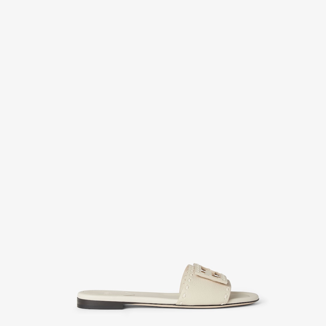 寬帶拖鞋。山茶花色壓紋皮革製成,綴有手工縫製同色系超大Selleria縫線,象徵著1925年以來,FENDI工匠代代相傳的標誌性Selleria工藝。同色系FF Baguette圖案。