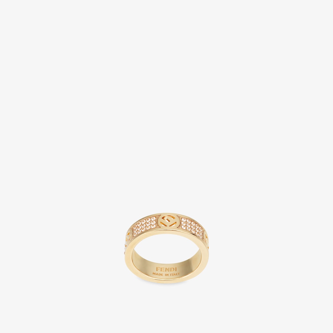戒指搭配F is Fendi造型的雕刻裝飾。鍍金金屬製品。飾有天然水晶。