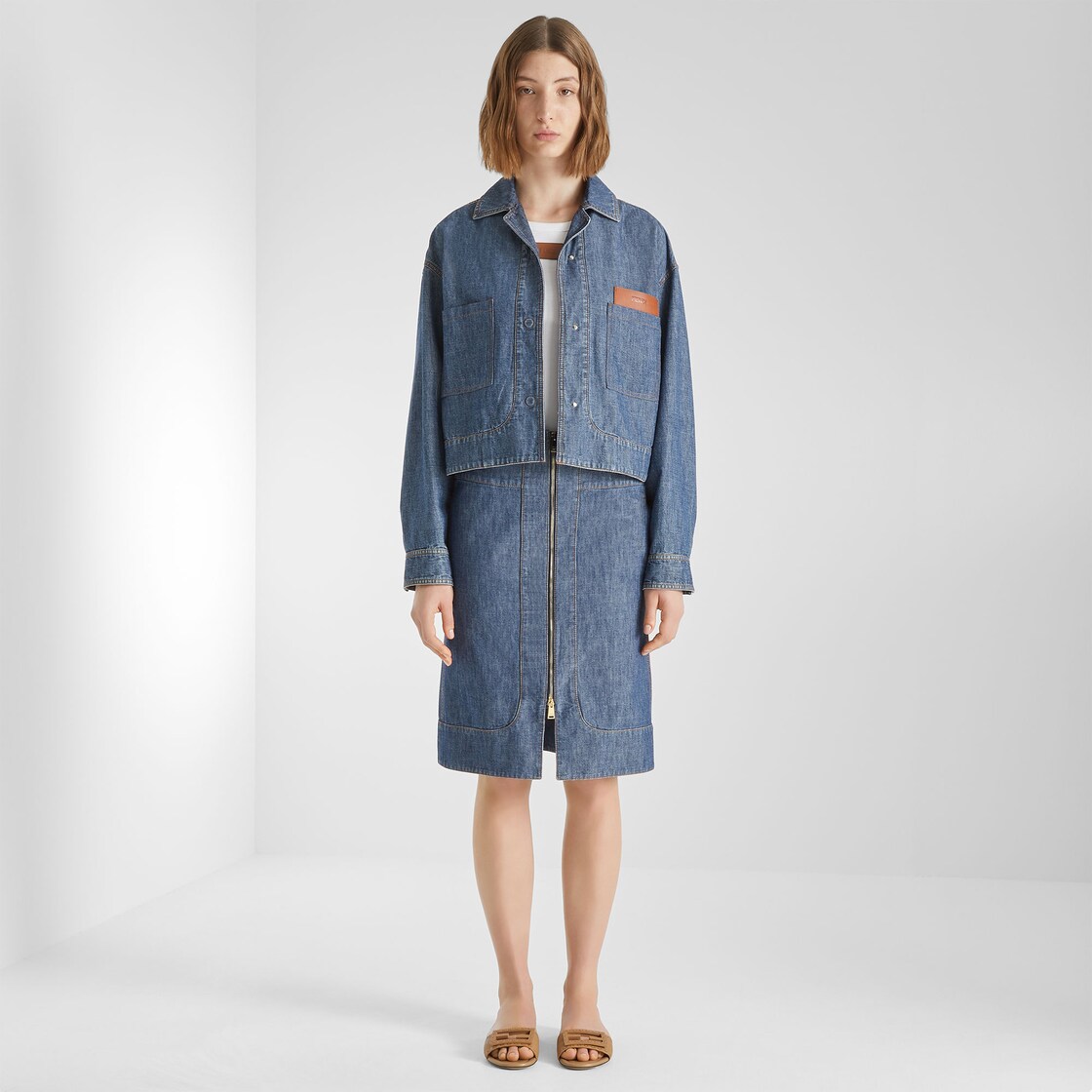 直筒中長半身裙。側邊口袋和背面中央開衩。正面拉鏈開合,附雙拉頭長拉鏈。海軍藍色棉質水手丹寧布製成,搭配對比色縫線。腰際有黃褐色皮革側帶搭配金屬鈕扣。金色飾面金屬製品。