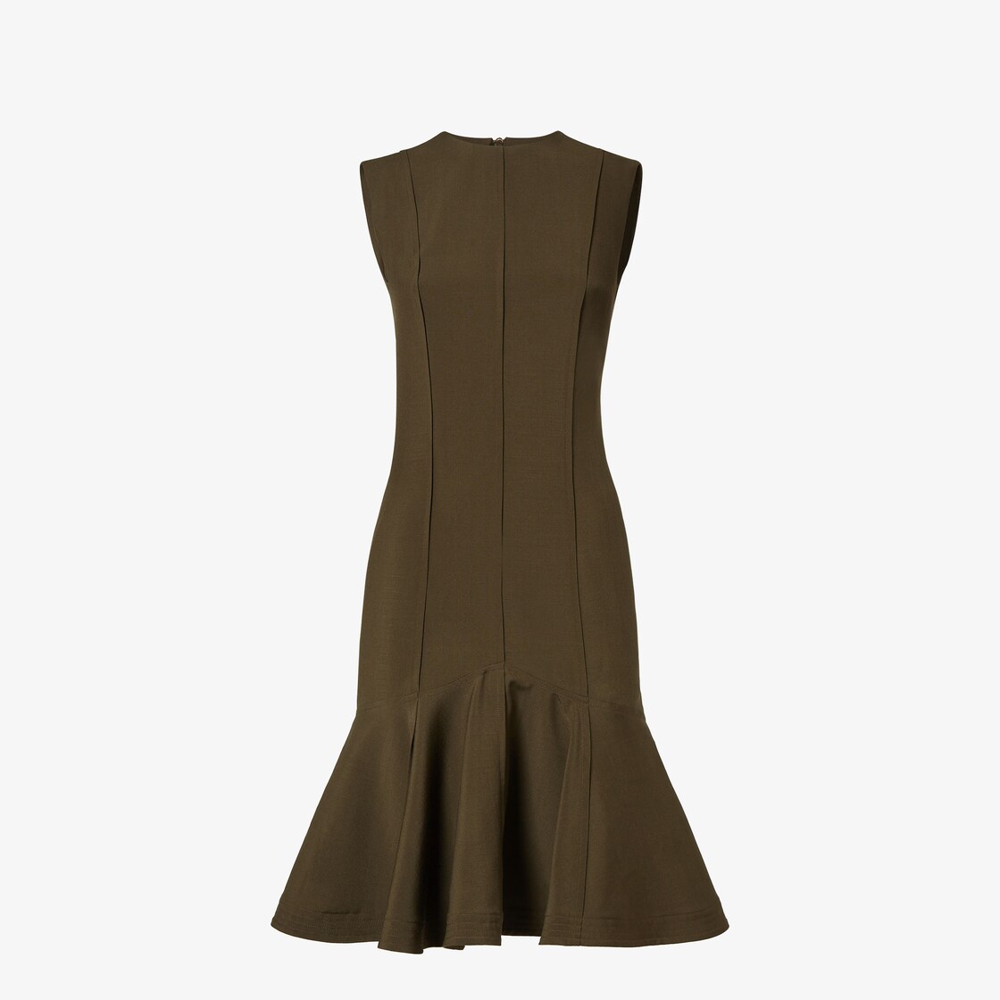 短袖裙裝,下襬飾有褶襇細節。圓領設計,背面採拉鏈開合。有襯裡。採橄欖綠羊毛和馬海毛製成。