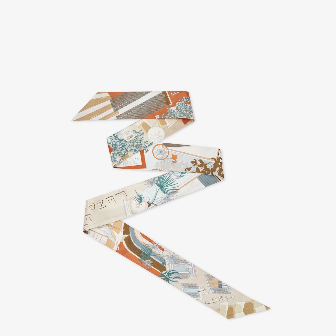 雙面可穿wrappy。可穿戴在脖子上、綁在手腕,或是當作包款配飾,增添繽紛色彩。絲綢製成,飾有「Walking around Rome」圖案,靈感源自羅馬的歷史區。結合經典品牌元素與傳統元素的圖案設計,結合橙色、綠色和米色色調。