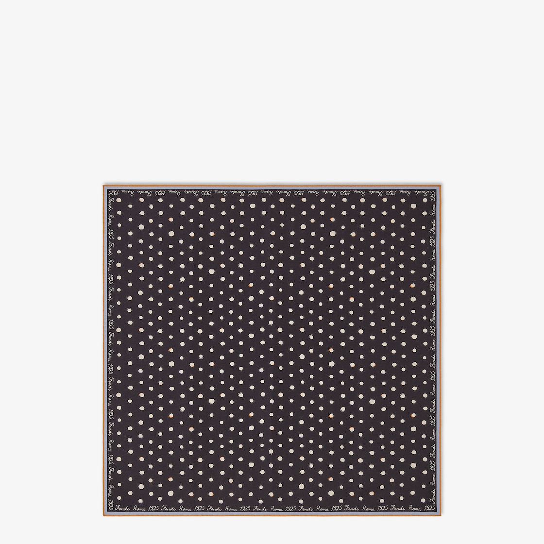 方形圍巾以黑色真絲製成。Falena Dots圖案以不規則設計,重新詮釋經典波卡圓點圖案,打造獨特的休閒風格。手工繪製的象牙色波卡圓點交替點綴標誌細節,邊緣飾有「FENDI Roma 1925」字樣,向品牌百年致敬。以條紋色塊飾邊,讓風格更為出色。手工飾邊。