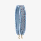 長肩帶,附雙彈簧鉤,可與任何有扣環的包款結合使用。以淺藍色水洗效果棉質丹寧製成,繡有形狀、尺寸和顏色各異的172顆玻璃串珠與218顆亮片,並綴以流蘇飾邊。金色飾面金屬製品。