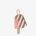克米諾巧克力造型卡片套,以紅色和粉紅色皮革和FF布料製成。拼色皮革設計採用角撐式開口,附有兩個內部卡槽和一個棕色皮革飾桿。螺絲鎖扣飾鏈可變化為吊飾或方便掛扣的配件。金色飾面金屬製品。