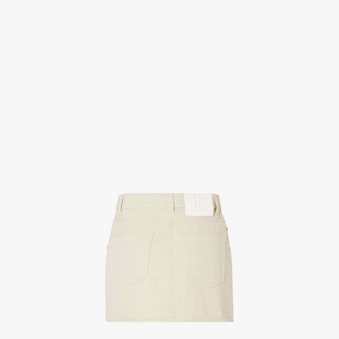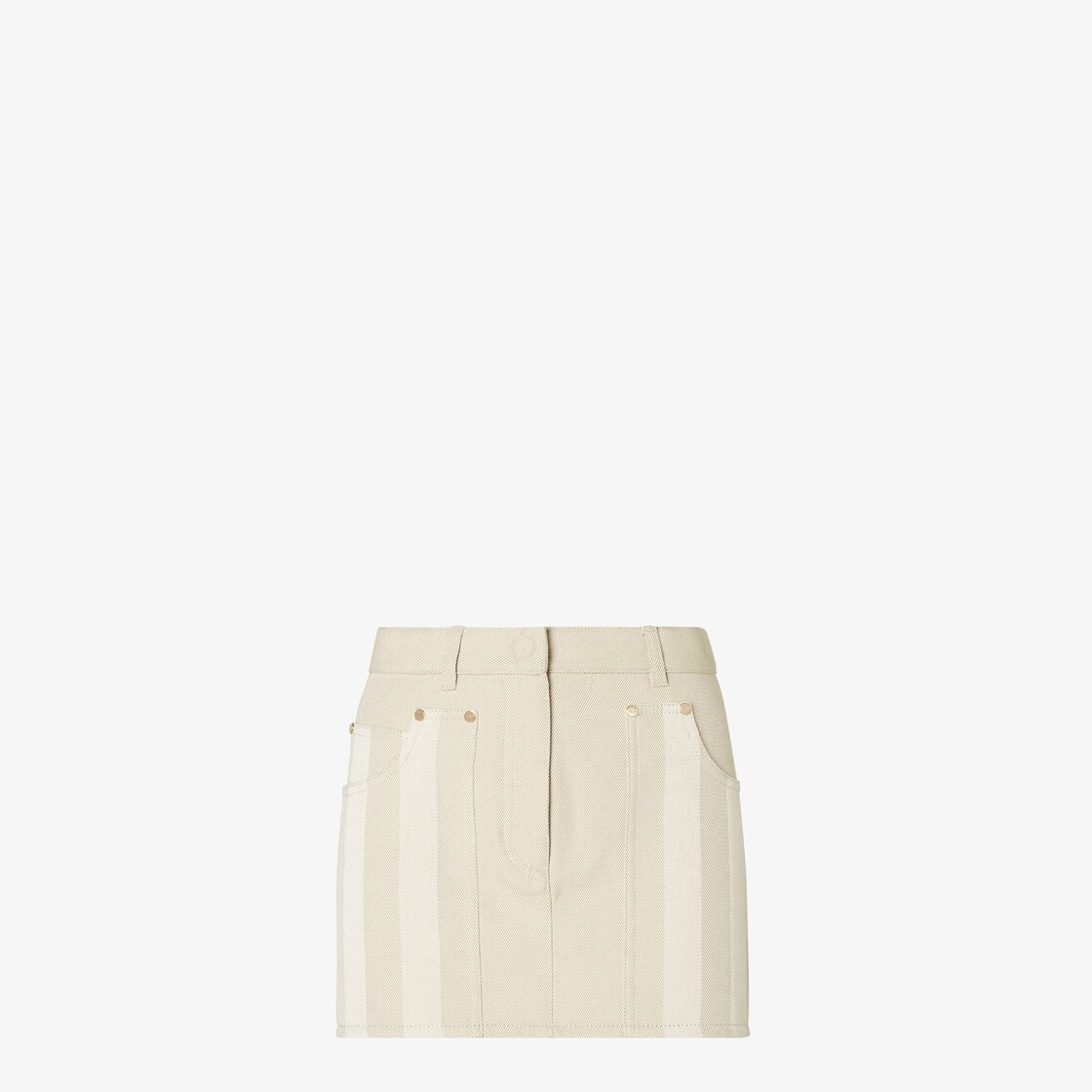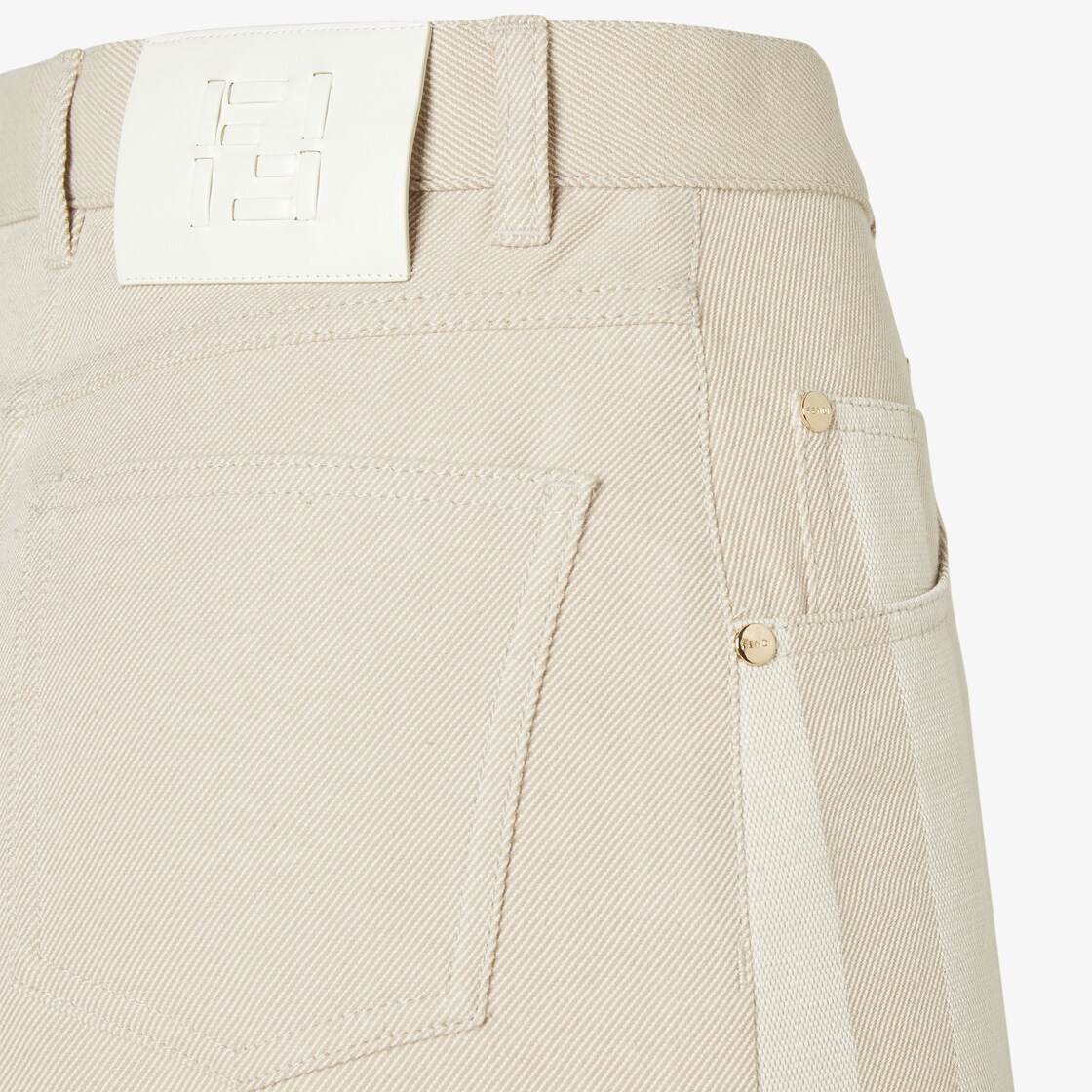五口袋短裙。腰際搭配皮帶環。隱藏式鈕扣與拉鏈開合設計。以米色棉質斜紋丹寧製成,正面口袋和手錶口袋飾有同色系Pequin提花圖案。飾有金色飾面金屬鉚釘。白色皮革背面繫帶,綴以FF Selleria細節。