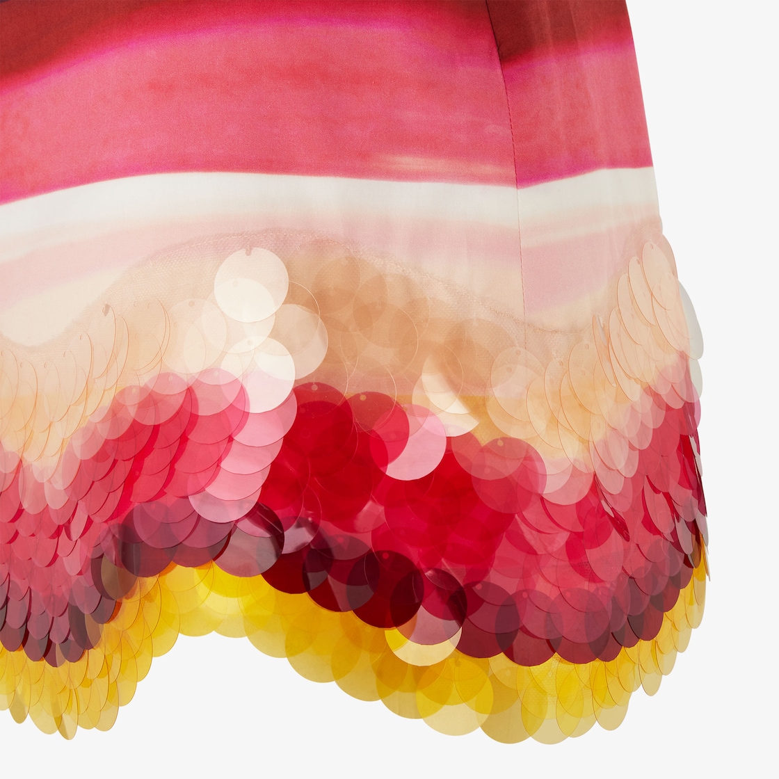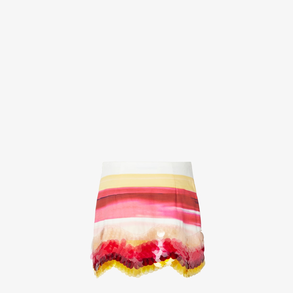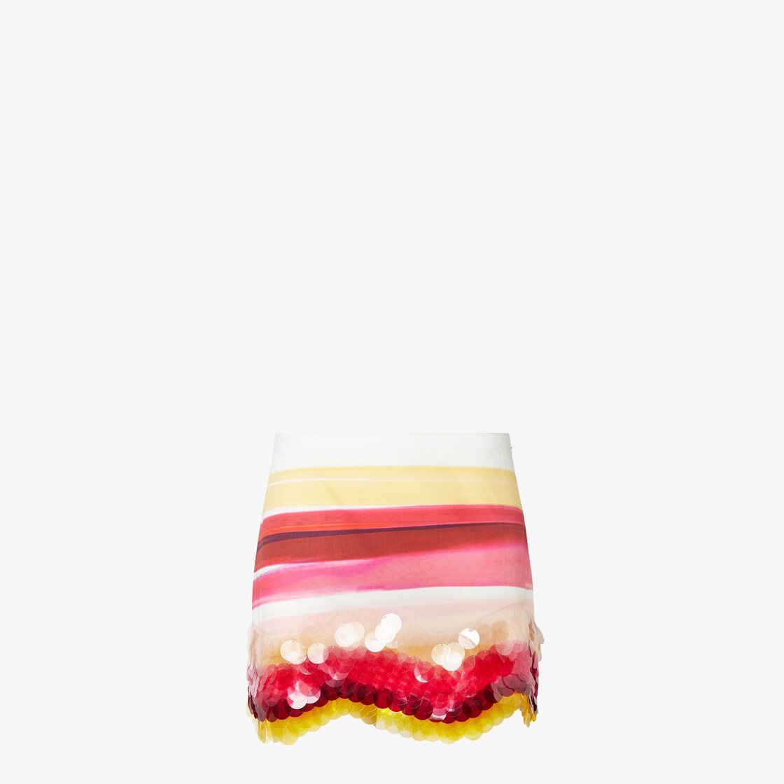 短版合身半身裙。側面採拉鏈開合設計。白色棉質府綢製成。印有滿版覆盆子紅和黃色威尼斯條紋圖案,下襬綴以同色系超大圓形亮片刺繡。
