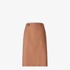 喇叭中長半身裙,腰際兩側飾有縫針皺褶。側邊口袋,前後中央開衩。隱藏式正面拉鏈開合設計。棕色亞麻及棉製成。黃褐色皮革側帶和金色飾面金屬標誌鈕扣。