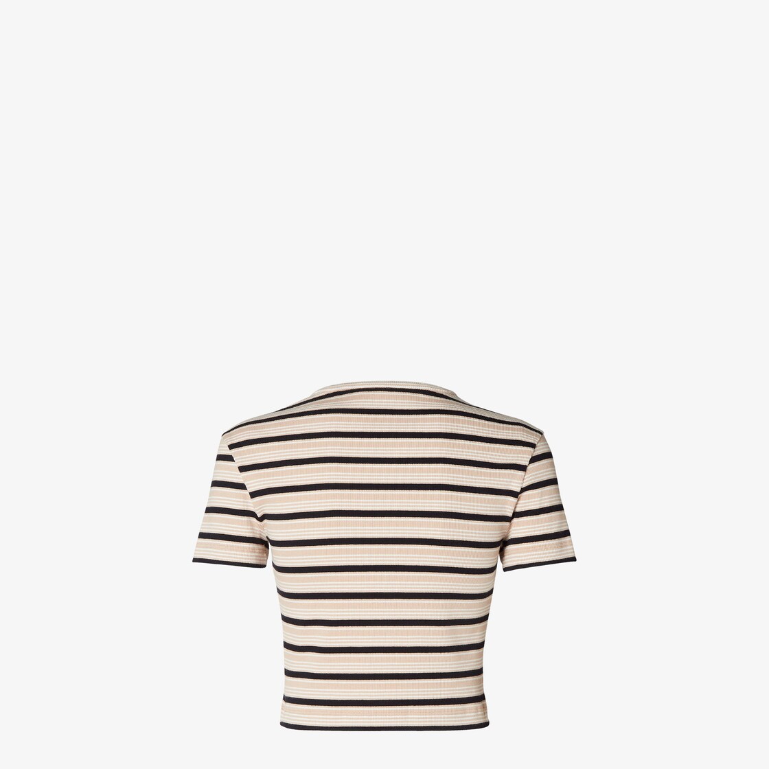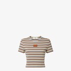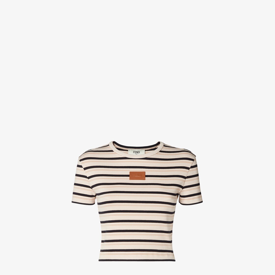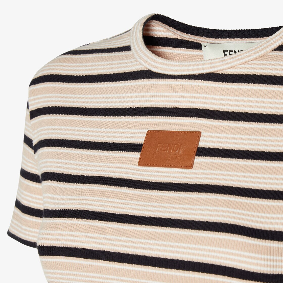 修身剪裁短版圓領短袖上衣。羅紋棉質針織布製成,飾有淺粉紅色、黑色和白色條紋圖案。胸前中央綴有黃褐色皮革FENDI貼片。