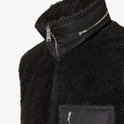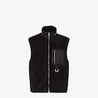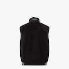 高領背心,胸前有拉鏈口袋。背面有直式口袋和可調式繫帶,搭配金屬FF帶扣。雙拉頭拉鏈開合設計。黑色捲曲人造皮草製成。正面綴有黑色尼龍細節和金屬FF環。鈀色飾面金屬製品。