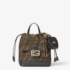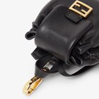 Nano backpack decorated with an FF clasp. Made of soft, black nappa leather. Features a front flap, snap button clasp and drawstring closure, with tone-on-tone leather cords. The detachable clip allows it to be attached to larger bags or belts as a charm. Can be also be worn on the wrist thanks to the elasticized straps. Gold-finish metalware. Can hold a credit card, lipstick and earbuds.