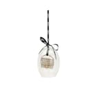 Christmas bauble in clear blown glass with fine, black grosgrain ribbon customized with the Fendi logo. Inside, a precious miniature Baguette bag glitter fabric decorated with gold-colored laminated leather details. Micro FF clasp and gold-finish metalware.