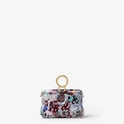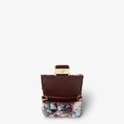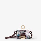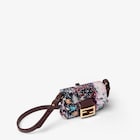 Iconic Nano Baguette bag, with flap and FF clasp with snap button. The clip allows it to be attached like a charm to larger bags or belts. Can also be worn cross-body thanks to the slender adjustable, detachable chain shoulder strap. Credit card holder flat pocket inside. Embroidered all-over with multicolor sequins for a faded effect. Details and shoulder strap in burgundy calfskin. Gold-finish metalware.