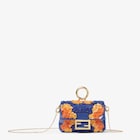 Iconic Nano Baguette bag, with flap and FF clasp with snap button. The clip allows it to be attached like a charm to larger bags or belts. It can also be worn cross-body thanks to the removable, fine chain shoulder strap. Credit card holder flat pocket inside. Entirely embroidered with neon blue beads and transparent sequins in orange that create a refined all-over floral motif. Inspired by Venetian murrine; it requires 3,780 beads and 1,855 sequins. Trimmed in neon blue calfskin and embellished with an FF clasp. Gold-finish metalware.