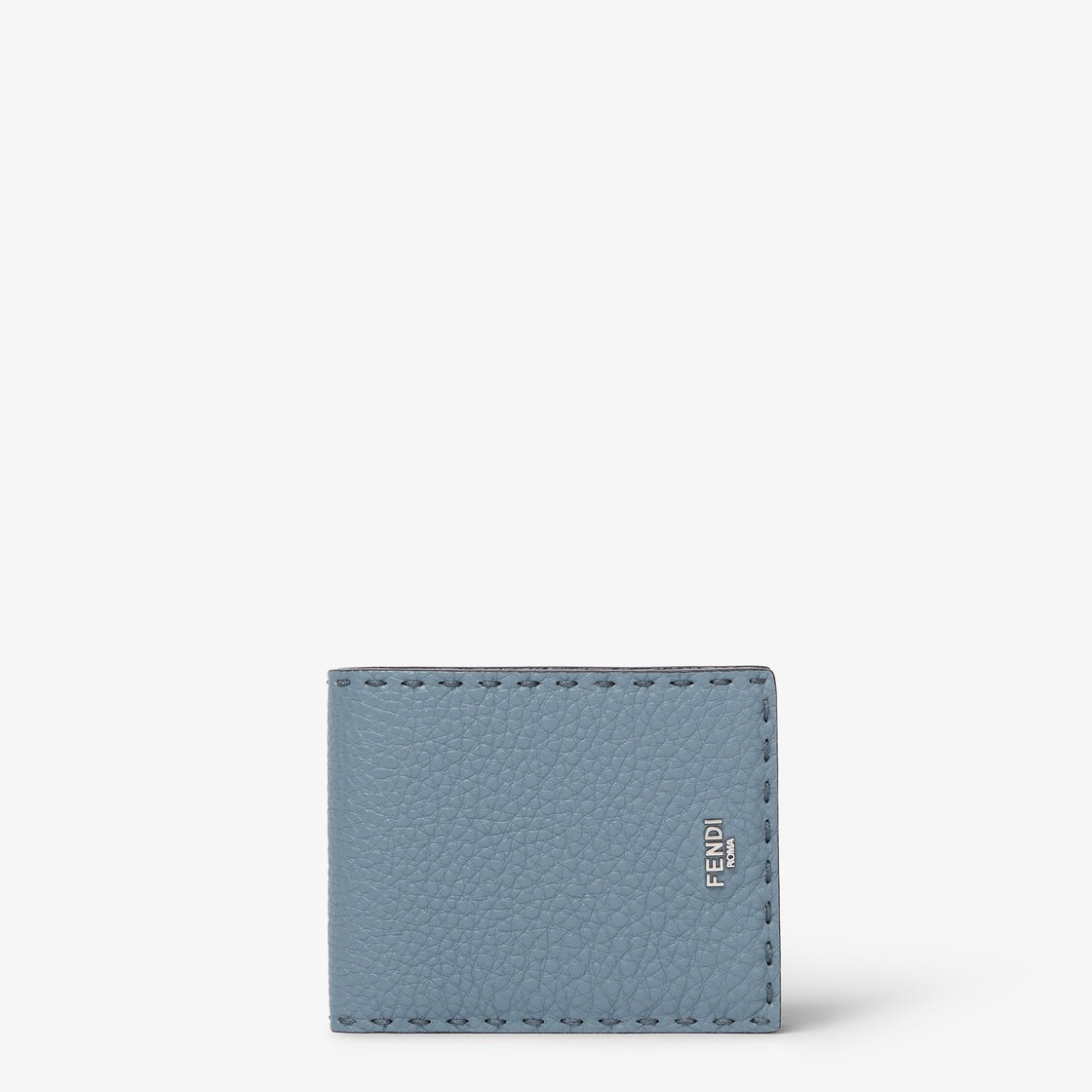 Bi-fold wallet features four card slots, a pocket for bills and a practical coin compartment closed with a snap. Made of Mercury blue Cuoio Romano leather with 132 hand-sewn macro topstitches, an emblem of the iconic Selleria workmanship handed down through generations of Fendi artisans since 1925. Contrasting dark gray leather lining. Metal Fendi Roma logo with a palladium finish.