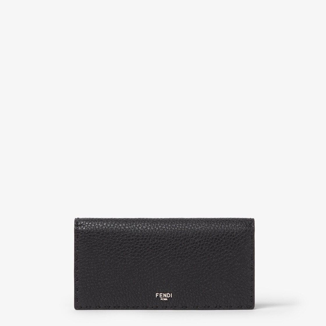Continental wallet organized with 14 cardholder slots, three flat pockets and a zip pocket. Made of black Cuoio Romano leather with 141 hand-sewn macro topstitches, an emblem of the iconic Selleria workmanship handed down through generations of Fendi artisans since 1925. Contrasting yellow leather lining. Metal Fendi Roma logo with a palladium finish.