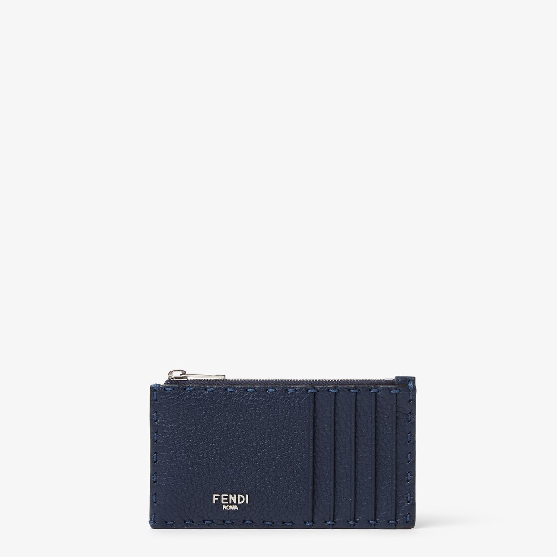 Card holder organized with four card slots and a flat, zipper pocket. Made of Cuoio Romano leather, dark blue on one side and dark red on the other, with 78 hand-sewn macro topstitches, an emblem of the iconic Selleria workmanship handed down through generations of Fendi artisans since 1925. Palladium-finish metalware.
