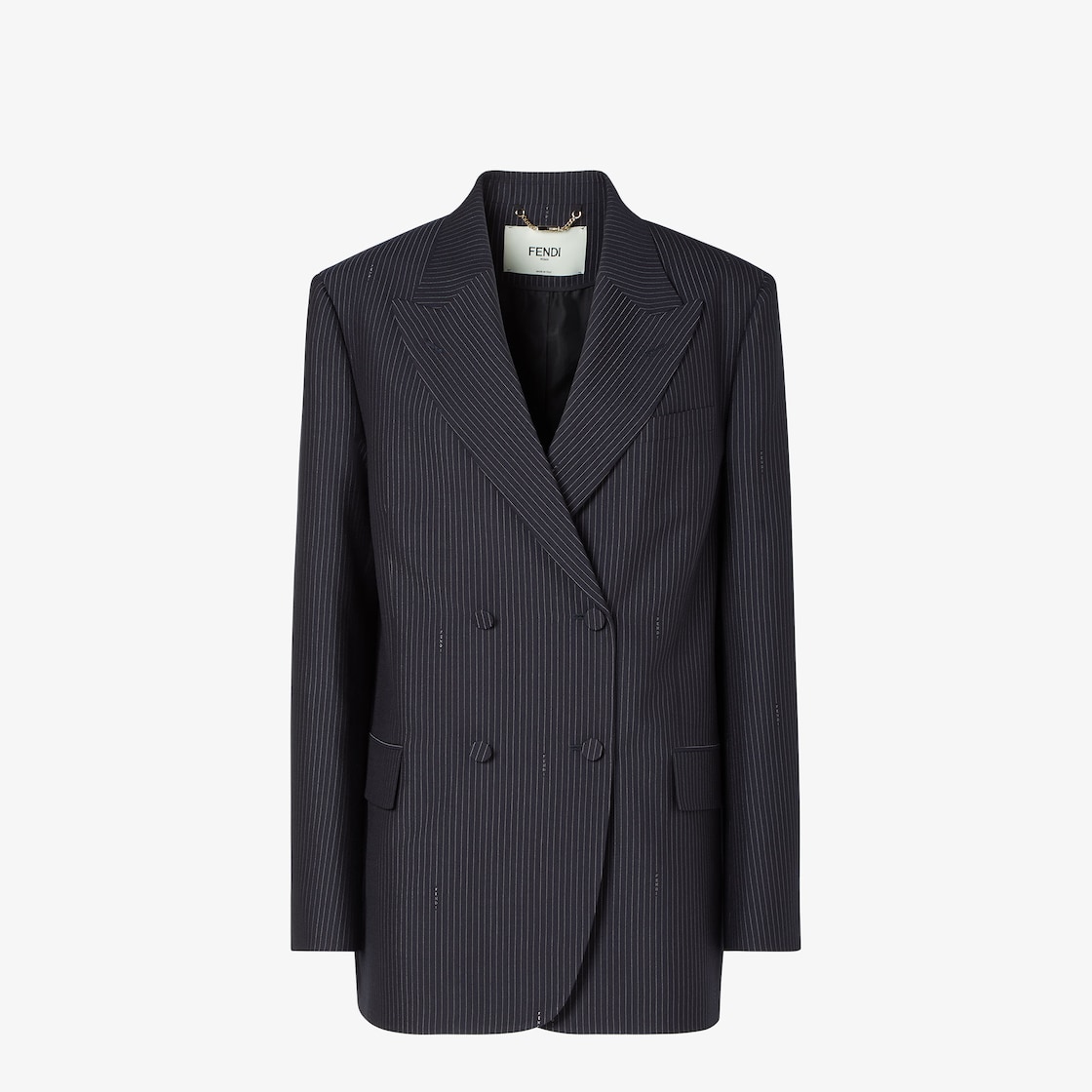 Slightly elongated double-breasted blazer. Peak lapel collar, long sleeves and breast pocket. Welt pockets with front flap. Covered button closure in matching tone. Made of blue wool with a Fendi pinstripe motif. Can be worn with the classic double-breasted closure or fastened with the central button alone for a more relaxed fit.