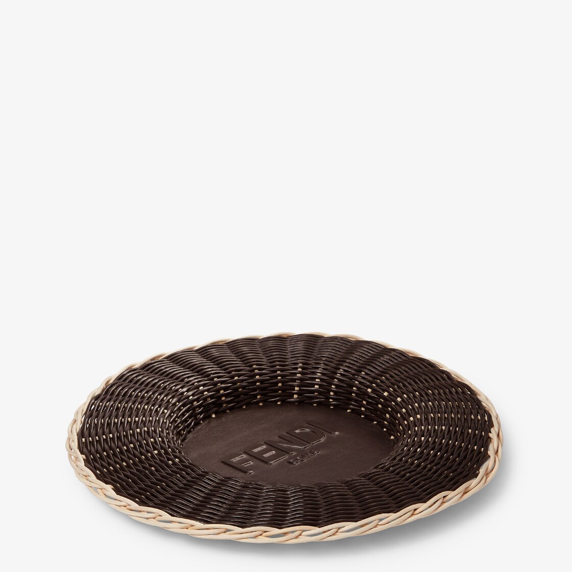 Ebony-color hand-woven leather placemat, with a natural tone edge. Intent on consolidating the close relationship between furniture and the world of fashion, this elegant placemat is decorated with an embossed Fendi logo. A union of craftsmanship and design, the Fendi Casa accessories range offers unique and sophisticated objects created to make every dining experience special.
