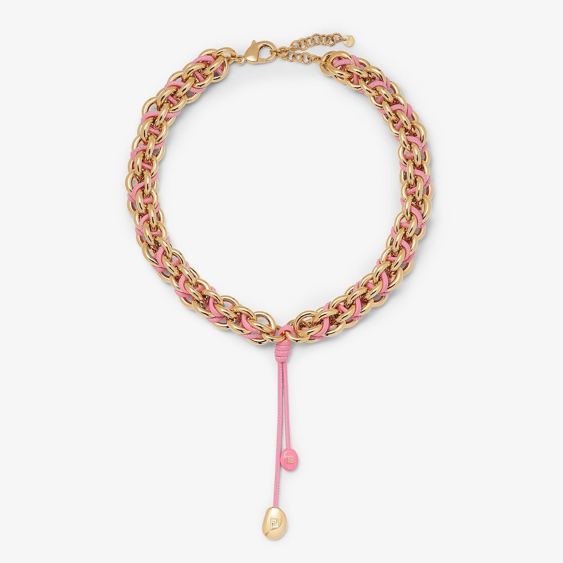 Fendi Candy necklace. Adjustable snap hook clasp at the back. Made of gold-finish metal and pink calfskin. The braided metal and leather converge in a central strap, accented with two FF logo “candies” in gold-finished metal with pink enamel.