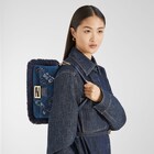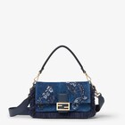 Made of blue denim with a flocked texture, embellished with butterflies embroidered in yarn, beads and sequins. Decorated with FF clasp and soft fringes around the edges.