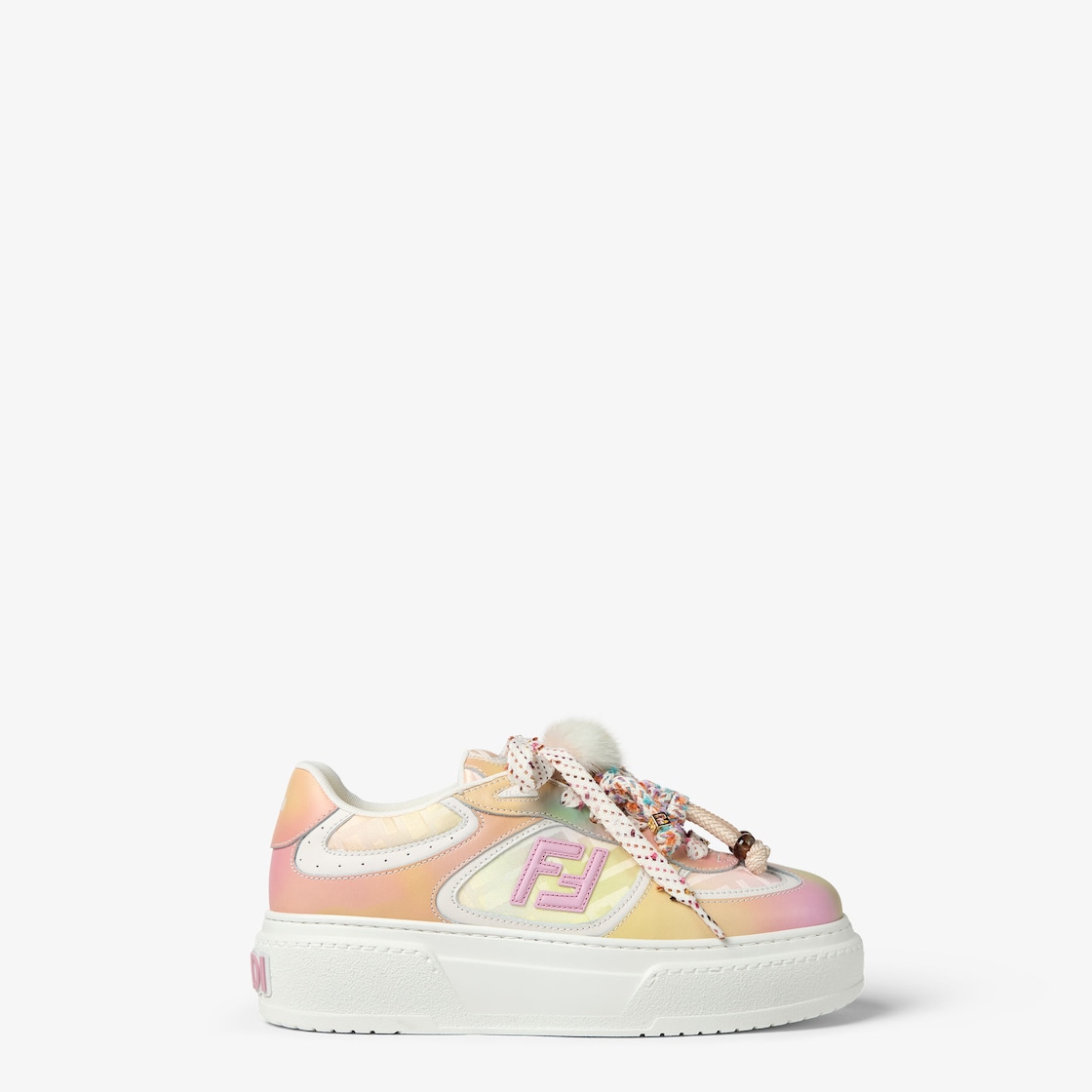Lace-up Fendi Match sneakers from the “Fantastic Fendi Future” capsule collection designed in collaboration with Japanese artist AYA TAKANO. Made of graduated leather and technical fabric details with the iconic tone-on-tone FF motif. Pink leather FF appliqués on the sides and multicolor hiking laces. Rubber platform sole with oversized, embossed Fendi lettering at the back. Completed with charms attached by a metal ring onto the tongue: the right shoe is adorned with a small doll in braided cord with mink details and bracelets with FF motif in gold metal. The left shoe is embellished with a macro pink taffeta bow completed by a white and pink cord and gold-colored metal FF and resin tortoiseshell-effect bead.