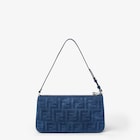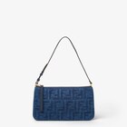 Slim Baguette pouch with zipper closure, embellished by an FF motif leather zipper pull. Adjustable and openable short shoulder strap on one side to allow dual portability, under arm and by hand. Made of blue FF denim with a flocked texture. Details in dark blue calfskin. Gold-finish metalware.
