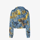 Reversible windbreaker jacket with drawstring edge. Cropped style with low-set long sleeves and elastic cuffs. Vertical welt pockets on both sides. Zipper closure with double slider. Made of Light blue FF nylon with all-over Falena print in black and yellow. Solid-color light blue lining with tone-on-tone leather Fendi Roma patch on the chest. Palladium-finish metalware.
