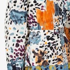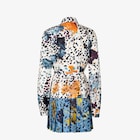 Short shirt dress with shirt collar and long sleeves. Breast pocket. Waistline seam and pleated skirt. Visible front button closure. Made of silk taffeta with the Falena print in two tones, white and light blue, creating a double layer effect.