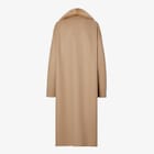 Oversize coat with a large collar and fur lapels. Low-set sleeves and horizontal welt pockets on the sides. Fastens with matching belt. Made of lightweight double-face cashmere in beige. Embellished with a matching embroidered logo on the left-hand cuff. Paired with a matching double belt in cashmere: one with a tone-on-tone covered buckle, the other with a palladium-finish metal FF buckle.
