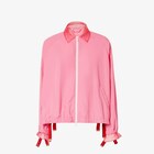 Bomber-inspired jacket with shirt collar and raglan sleeves. Slanted pockets and zipper closure. Elastic strap inserted at the hem and cuff straps, with buttonhole adjustment, to modify the fit and define the volume of the silhouette. Made of pink technical viscose fabric. Embellished with organza details on the collar and cuffs.