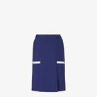 Straight-cut midi skirt with symmetrical slits at the front. Contrasting elastic straps on the sides, with buttonhole adjustment, to modify the fit and define the volume of the silhouette. Side pockets and zipper closure on the left side. Made of dark blue lightweight mohair. Lined in micro FF jacquard in the same tones.