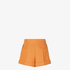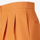Flared shorts with double pleat on the front. Side pockets and turned-up hem. Concealed zipper and hook closure. Made of orange Grain de Poudre wool. Embellished with Fendi lettering in matching-tone embroidery on the left-hand side.