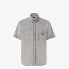Shirt with button-down collar and short sleeves. Breast pocket and reverse pleat on the back. Visible button closure. Made of denim fabric with a faded gray stonewash treatment. Embellished with gray leather Fendi patch applied on the breast pocket and jacron stitching motif on the back of the collar.