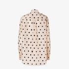 Oversized classic shirt. Long sleeves with dropped shoulders and shirt cuffs. Rounded asymmetric hem. Concealed button closure. Made of pink taffeta, printed all-over with the Falena Dots motif in a contrasting color.