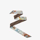 Two-sided wrappy. Can be worn around the neck, knotted at the wrist or used to accessorize a bag with a touch of color. Made of silk. One side features a blue-toned Fendi Flowers motif, inspired by Rome’s flower market and designed to capture the city’s atmosphere in a pattern that echoes the collection’s theme. The other side is printed with the iconic brown FF motif.