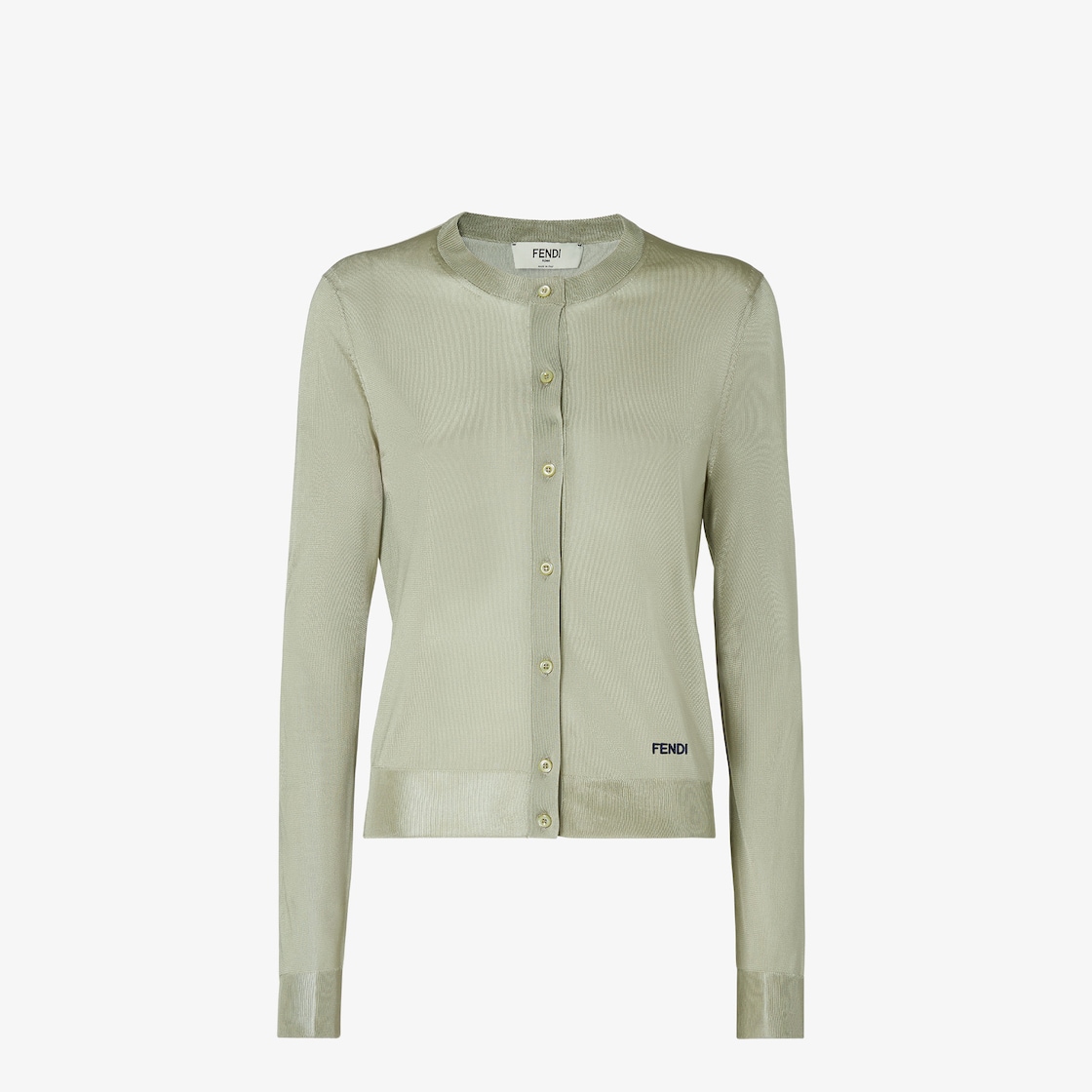 Slim-fit cardigan with round neckline and long sleeves. Ribbed hems and button closure. Made of light green extra-fine shiny viscose yarn. Fendi logo embroidered at the hem in a contrasting color.